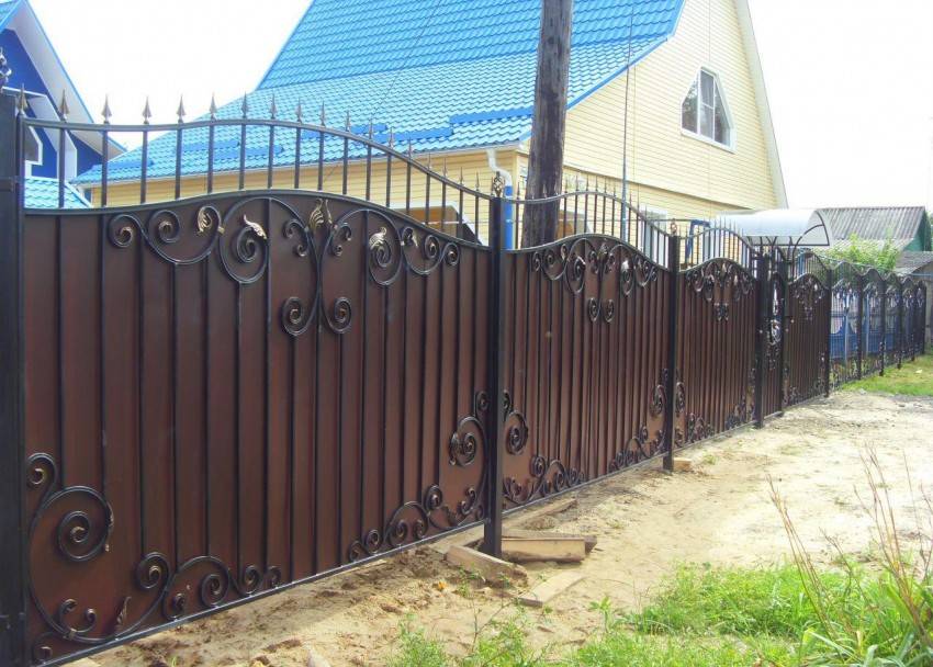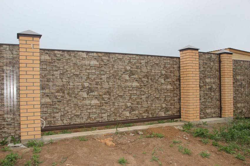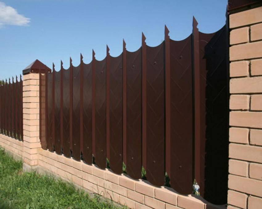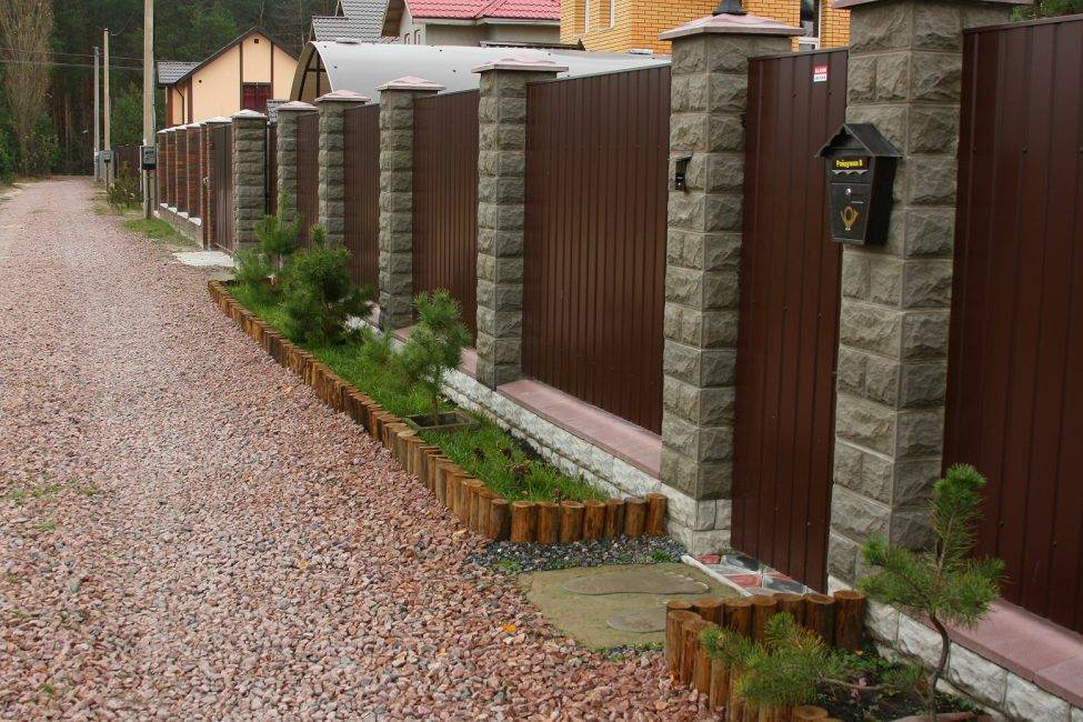 Несмотря на то, что материал имеет ряд преимуществ, он является простым, поэтому его необходимо чем-то украсить. Лучшее решение – создание декоративных элементов из камня, кирпича или дерева, оптимальный выбор – комбинированный забор с использованием профилированного листа и кирпича.