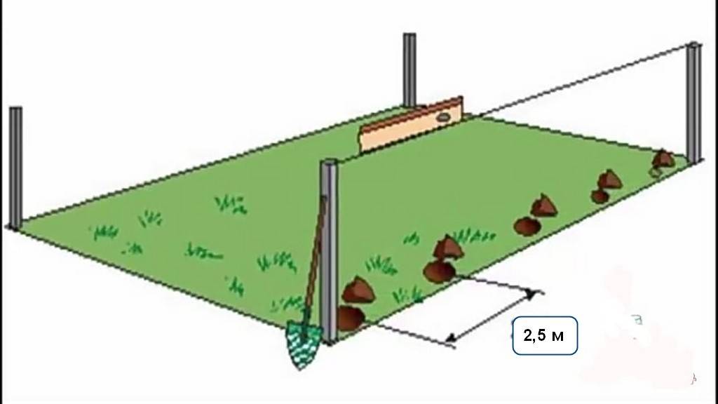 Выполняется с помощью веревки и деревянных колышков. Основные колышки вбиваются в землю в местах расположения столбов, вспомогательные ‒ через каждый погонный метр. Между ними натягивается веревка строго под углом 90 градусов.