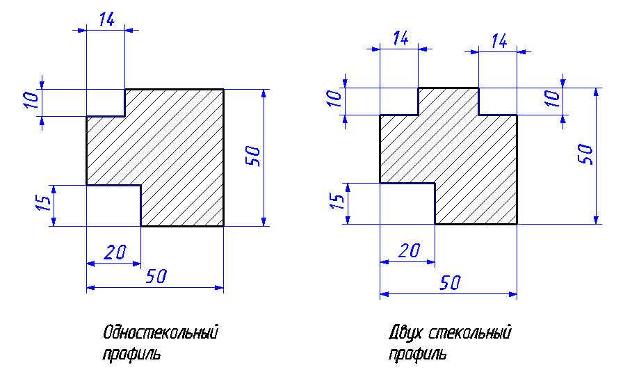- Одностекольный вариант оконного профиля должен будет иметь два прямоугольных паза, которые нужны для монтажа в коробе и для остекления.