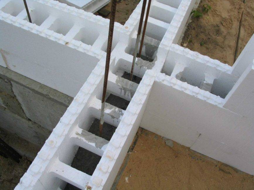 Конструкция представляет собой блоки, внутри которых пустота. Соединение обеспечивается металлическими опорами. В полое пространство заливают бетон, чтобы в результате получилась плотная стена из трёх слоев. Перед заливкой следует обеспечить проложение инженерных систем.