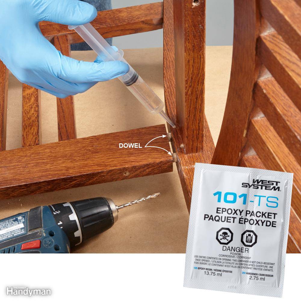 Если одно или два соединения на вашем стуле расшатались, однако разобрать его у вас нет возможности, попробуйте следующим метод. Введите небольшое количество эпоксидной смолы в расшатавшиеся соединения с помощью шприца.