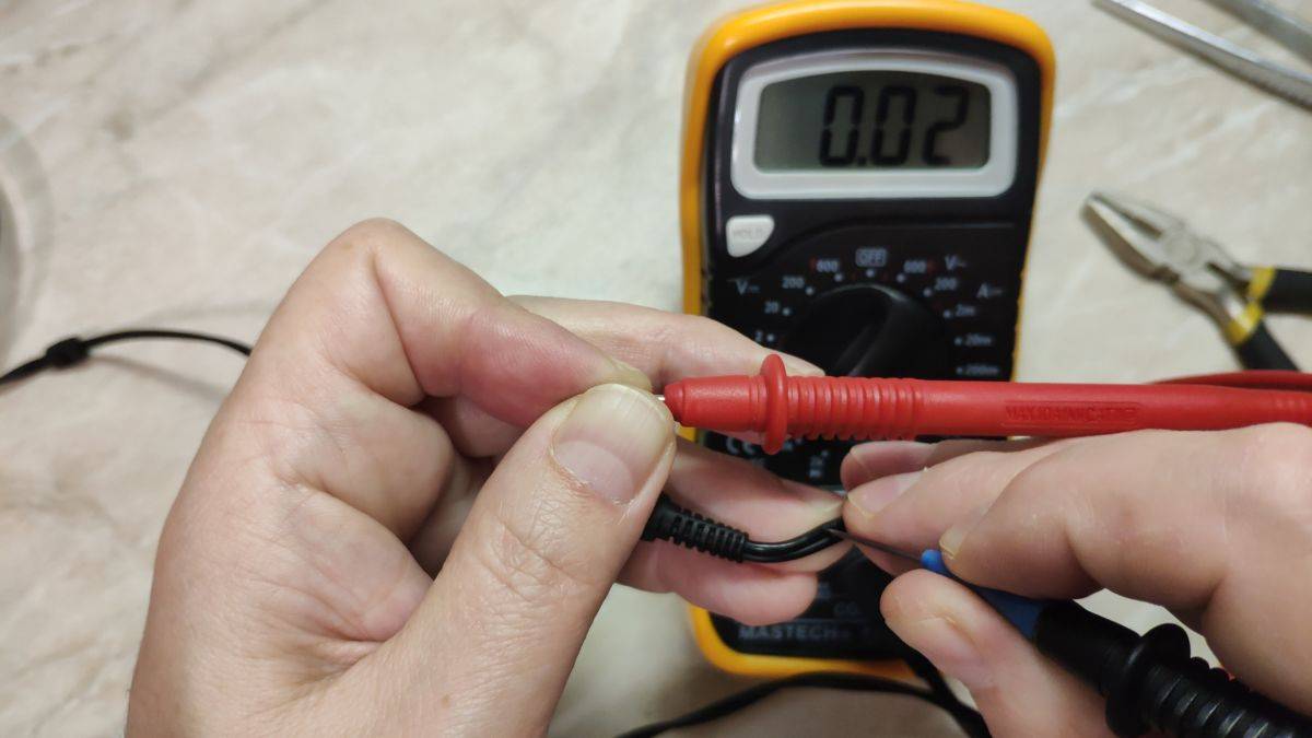 Кроме того, для более точного определения места разрыва, можно использовать тестер в режиме измерения сопротивления (Ом). Прикоснитесь одним концом любому из контактов штекера (левый или правый выход на наушники — это два крайних контакта), а на другой щуп прикрепить изолентой простую иголку и аккуратно воткнуть в провод чуть дальше от предполагаемого места разрыва. Если тестер покажет вместо 1 значение 0 или чуть больше нуля (значение с сотыми или десятыми), то в этом проводе произошел разрыв.