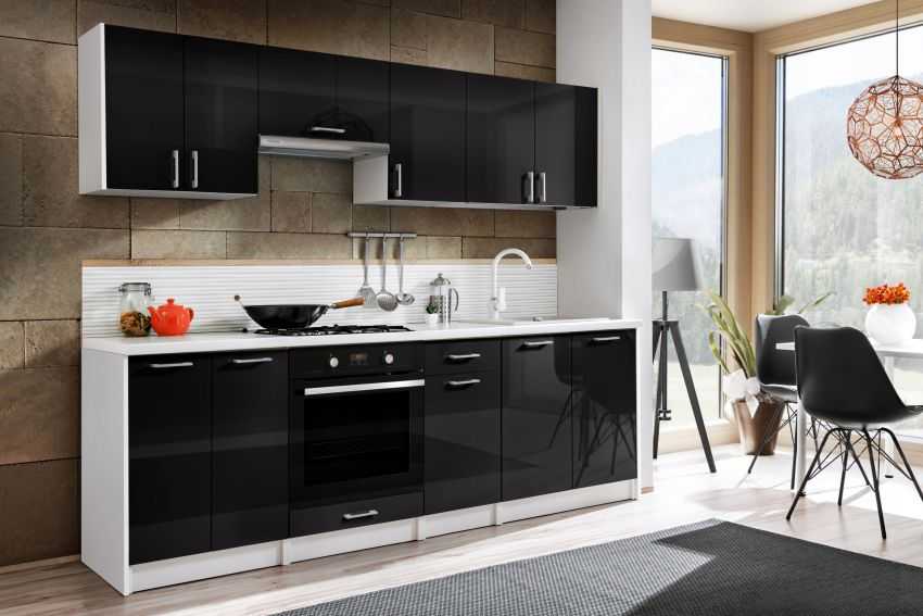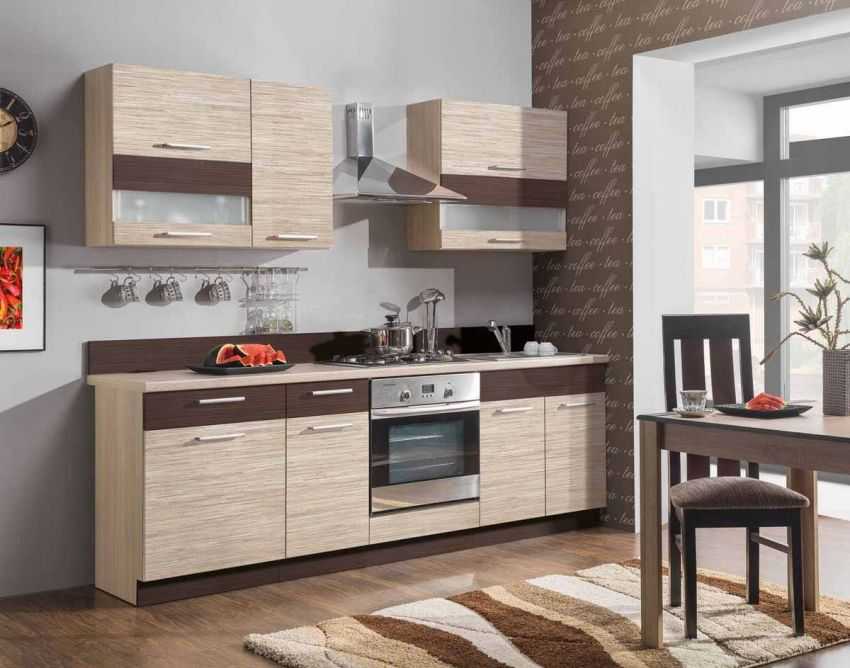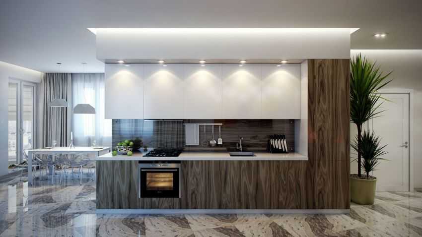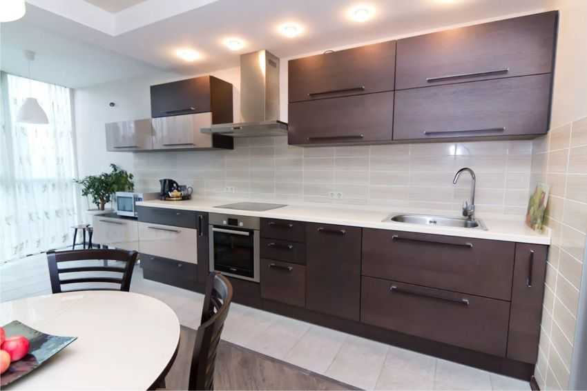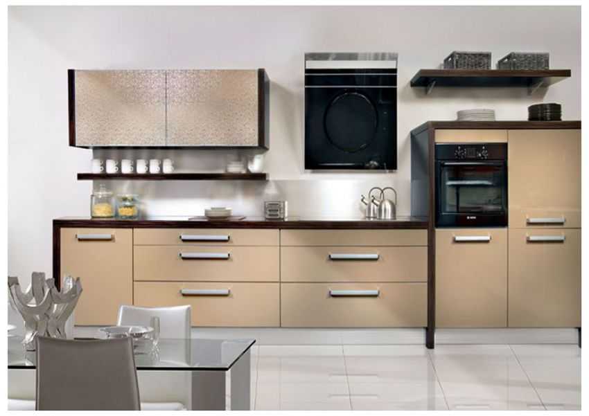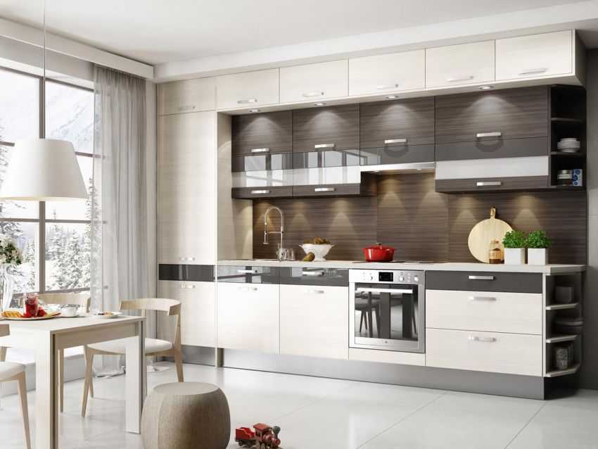 В современном дизайне прямой кухне могут использоваться множество различных цветов, материал, фактур и различных размеров модулей.