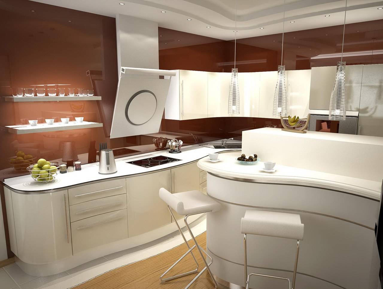 Отличаясь от стиля модерн – хай-тек кухни спокойно сочетают в себе неправильные геометрические фигуры и плавно перетекающие поверхности.