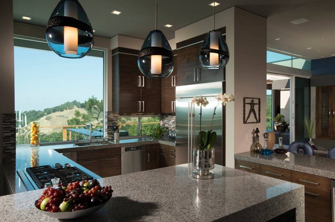В модернистском интерьере эстетика освещения играет ключевую роль в создании правильного настроения. В этом случае интересная форма ламп, однако, несколько важнее, чем их способность выделять данное пространство. Светильники для кухни в стиле модерн имеют характеристики современного дизайна, то есть четкие геометрические формы. Чаще всего используются большие подвесные люстры, которые располагаются над обеденным столом.
