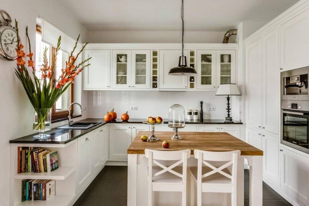 квадратные помещения. Декорируются угловыми кухонными гарнитурами. Они позволяют разграничить обеденную и рабочую зоны и правильно организовать рабочий треугольник. Напротив углового гарнитура устанавливается обеденный стол. Его столешница может быть стеклянной, что добавит интерьеру легкости и воздушности. Актуальны и складывающиеся модели, экономящие свободное пространство;