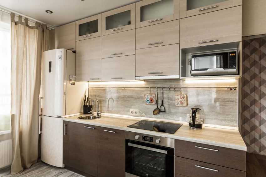 Если же техника в пеналах не принципиальный момент в расположении, холодильник лучше расположить в конце прямой кухни.