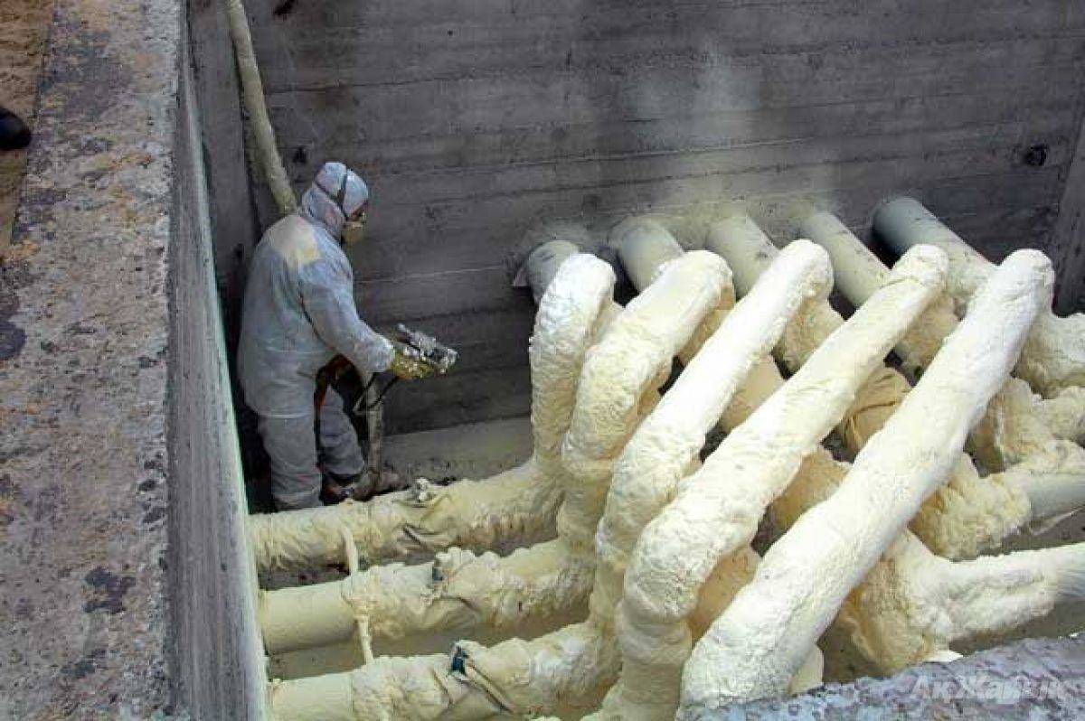 Особенность утепления методом напыления пенополиуретана в том, что теплоизоляция наносится на поверхность трубы, обеспечивая 100% герметичность (стоимость компонентов для ППУ заливки от 3,5 евро за кг).
