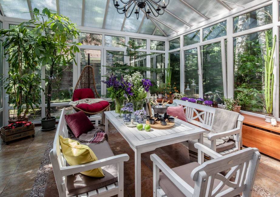 Веранда-зимний сад со стеклянными стенами и крышей. Растения, которые там будут находиться, желательно выбирать более-менее выносливые к теплу – к примеру, отлично приживаются пальмы, плющи, фикусы.