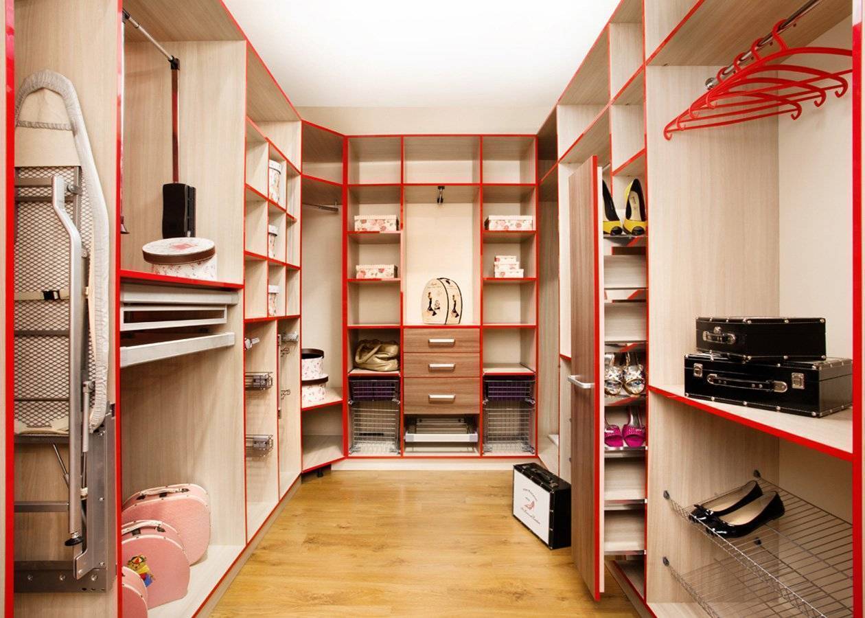 Самый практичный способ организации пространства, когда задействованы 3 свободные поверхности. Длина помещения должна быть не менее 1,6 – 1,8 м, а его ширина 1,75 – 2 м. В гардеробной можно расположить наибольшее количество вещей. Однако также как при параллельном способе хранения вещей, для перепланировки требуется достаточно просторная комната.