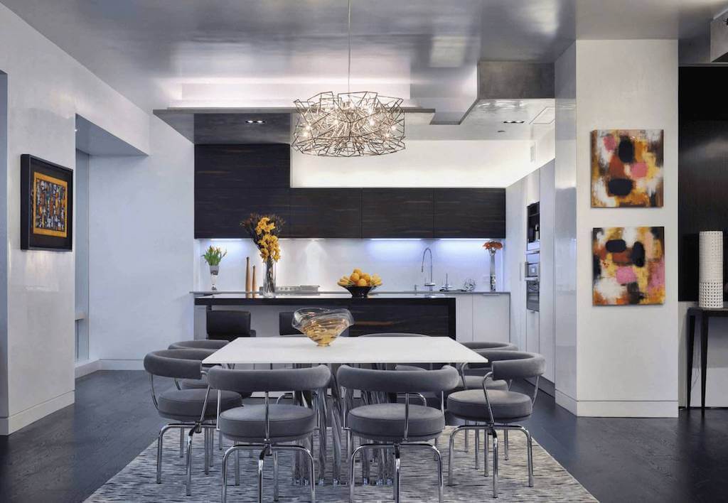 Шинная система светильников в столовой зоне является хорошим вариантом в том случае, если может возникнуть необходимость изменения положения светильников или стола.