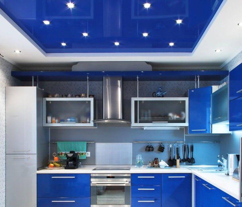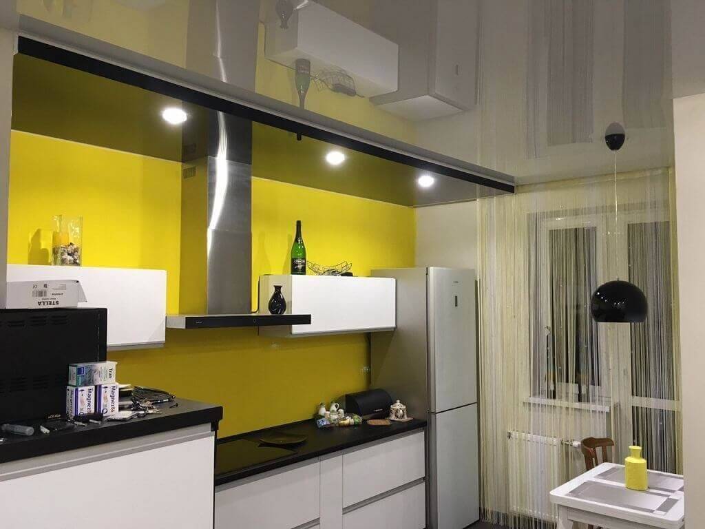 Не стоит забывать и про то, что цвет потолка также влияет на освещение. Например, если выбрано полотно белого холодного цвета, то добавление таких же холодных ламп создаст неуютную атмосферу на кухне.