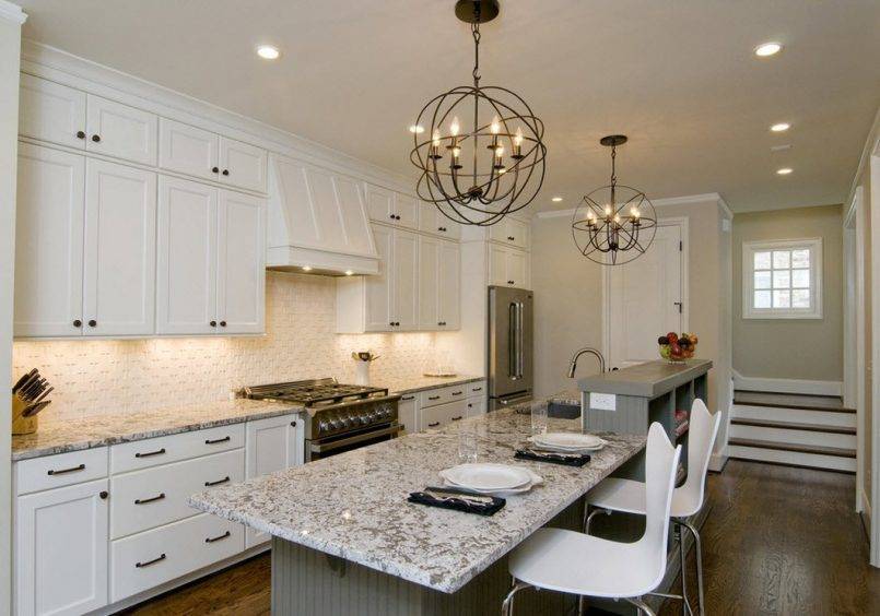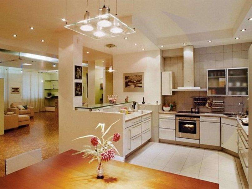 На кухне оборудование общего освещения не обязательно. Это функциональное помещение, в котором достаточно оборудовать освещение зон готовки, приема пищи.
