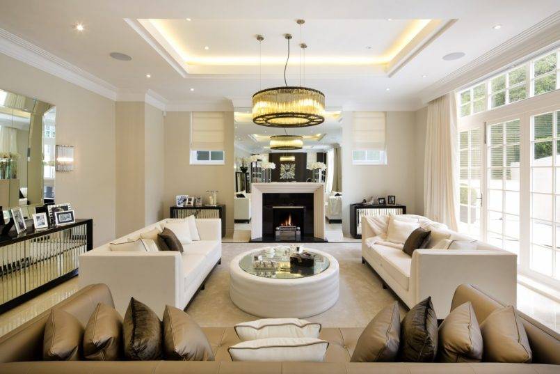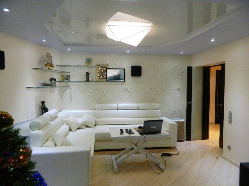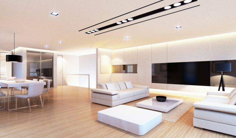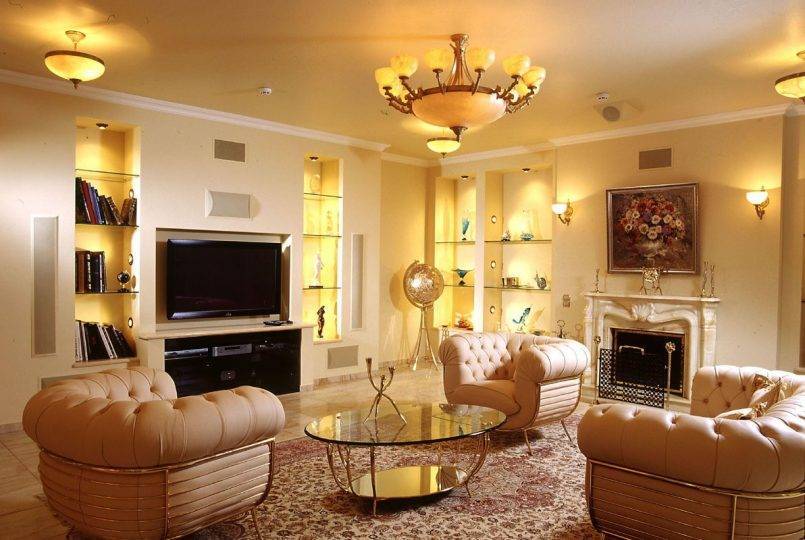 К наиболее ярко освещенному помещению в квартире относится гостиная. Это помещение желательно оборудовать общими осветительными элементами, точечными зонами в местах размещения диванов, кресел, журнальных столиков.