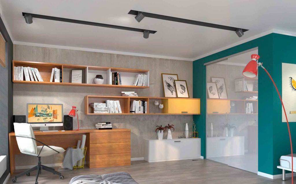 Подходит ребенку старше 10-ти любого пола. Верхний свет состоит из спотов. Они закреплены на шинах. Присутствует возможность перенаправить освещение. Рабочую зону располагают возле большого окна. Над столом размещена верхняя подсветка – на шине. С помощью подиума комната разделена на две зоны – рабочую и спальную. Цвет стен пастельно-холодный. Шторы и покрывало на кровати – темное.