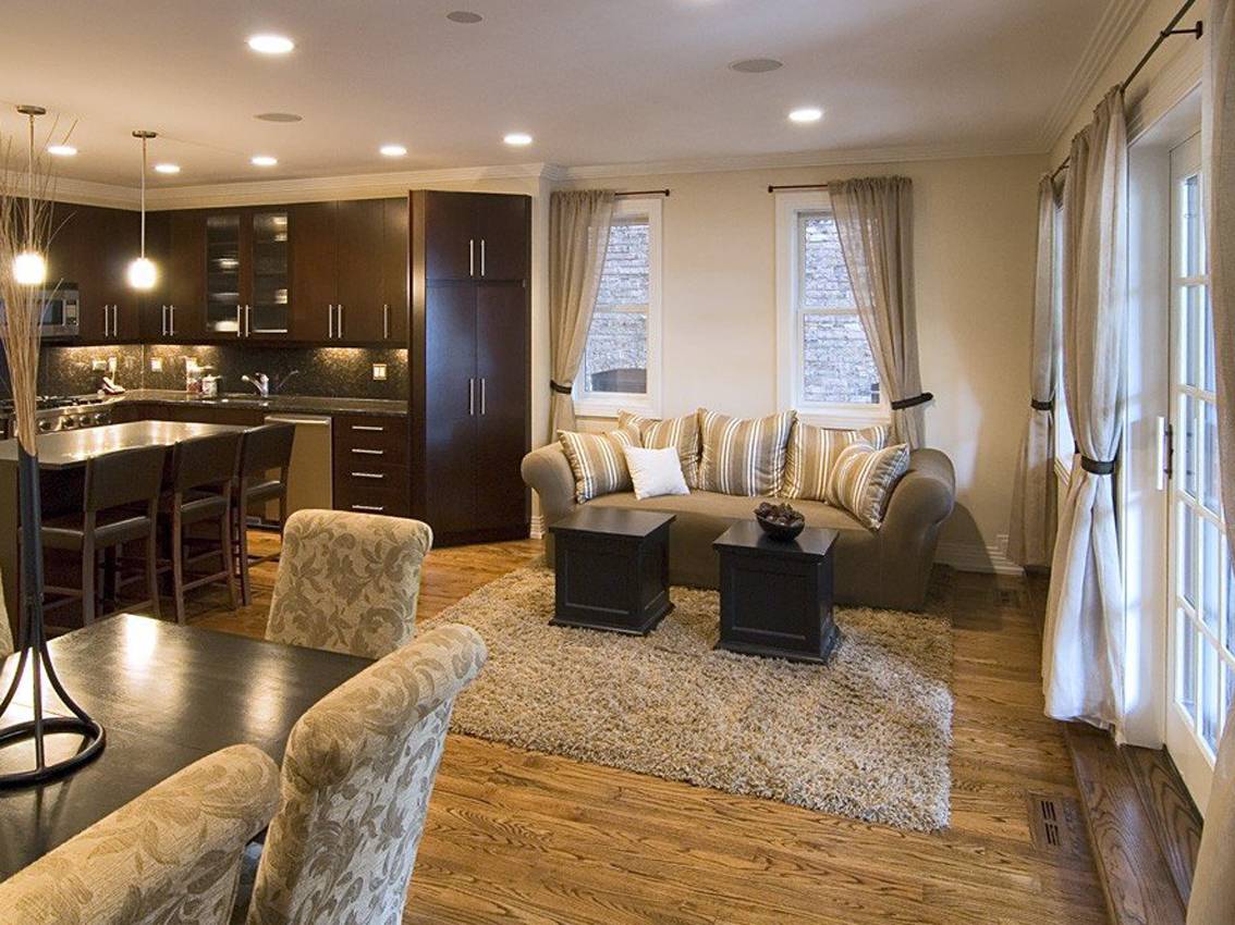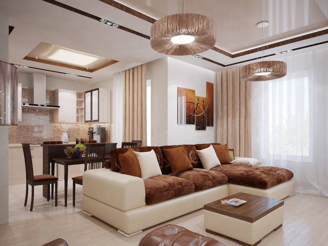 В оформлении интерьера кухни-гостиной существует определенное правило, большое и просторное помещение нуждается в более высоком уровне освещения, а в маленькой комнате с низким потолком должно быть установлено минимальное количество потолочных осветительных приборов.