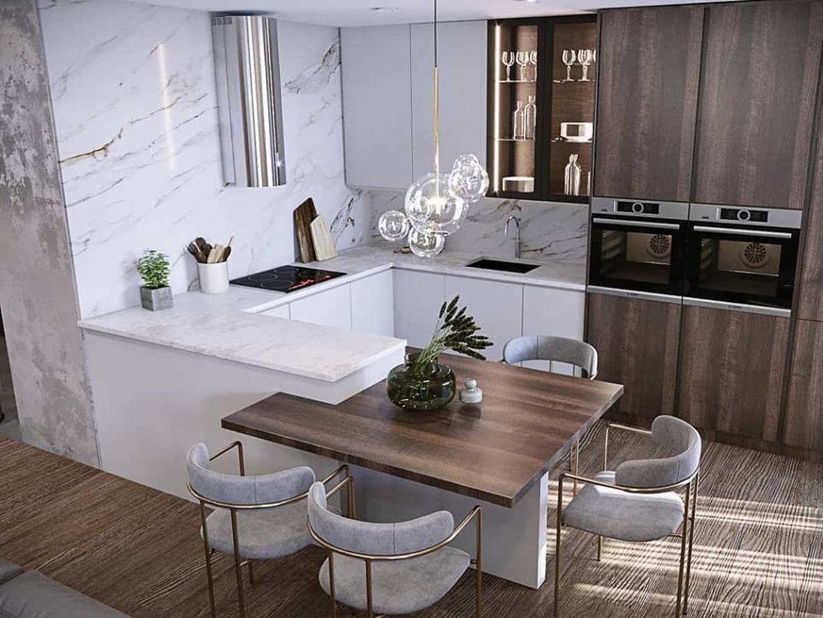 Часто планировка кухонного гарнитура подразумевает именно такое расположение места для приема пищи. Мебель может включать не только шкафчики, но и обеденный стол. То есть рабочая зона, варочная поверхность, места для хранения и стол представляют собой единый ансамбль.