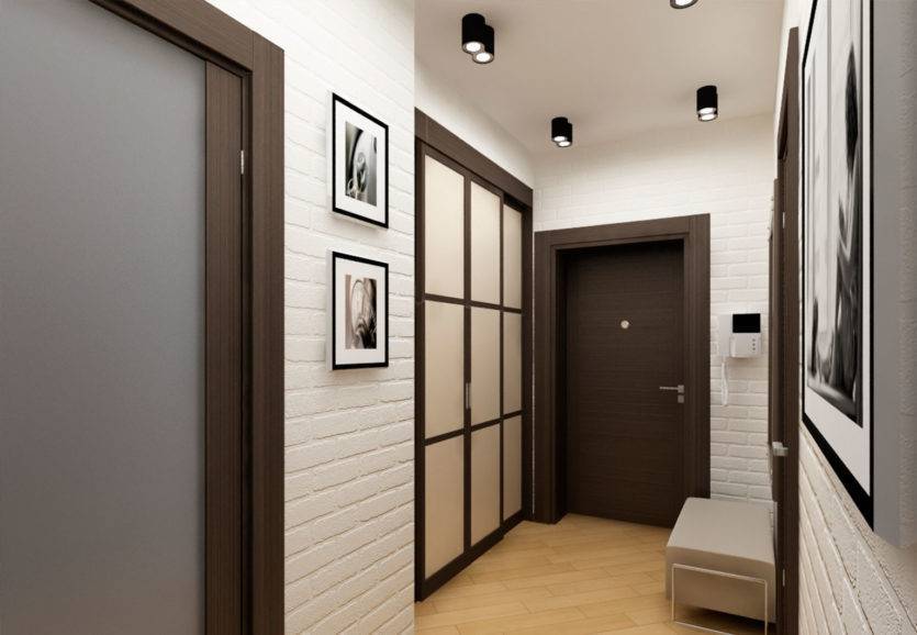 Он создает ощущение темного тоннеля, поэтому важно подобрать правильное освещение. Вдоль коридора можно установить споты или другие точечные светильники, направленные в сторону стен или висящих рамок и зеркал
