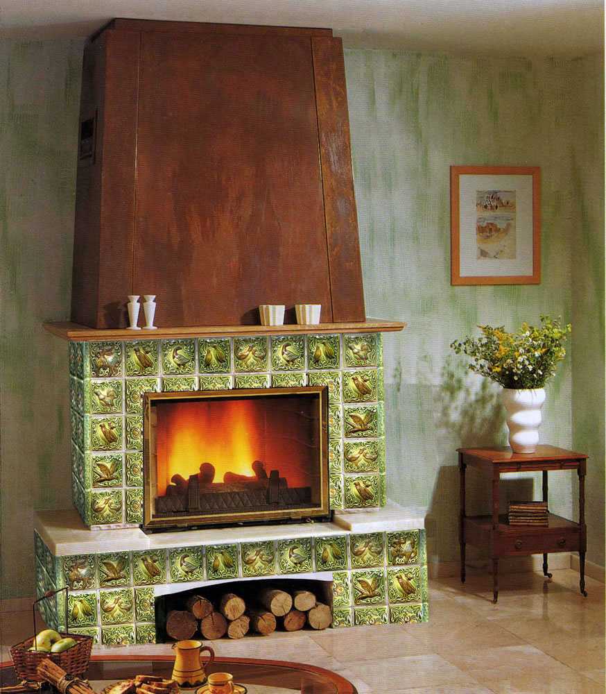 Камин с такой облицовкой имеет очень оригинальный, красивый и необычный внешний вид. Для отделки можно использовать глянцевые и матовые изразцы, с рельефной поверхностью либо каким-нибудь рисунком.