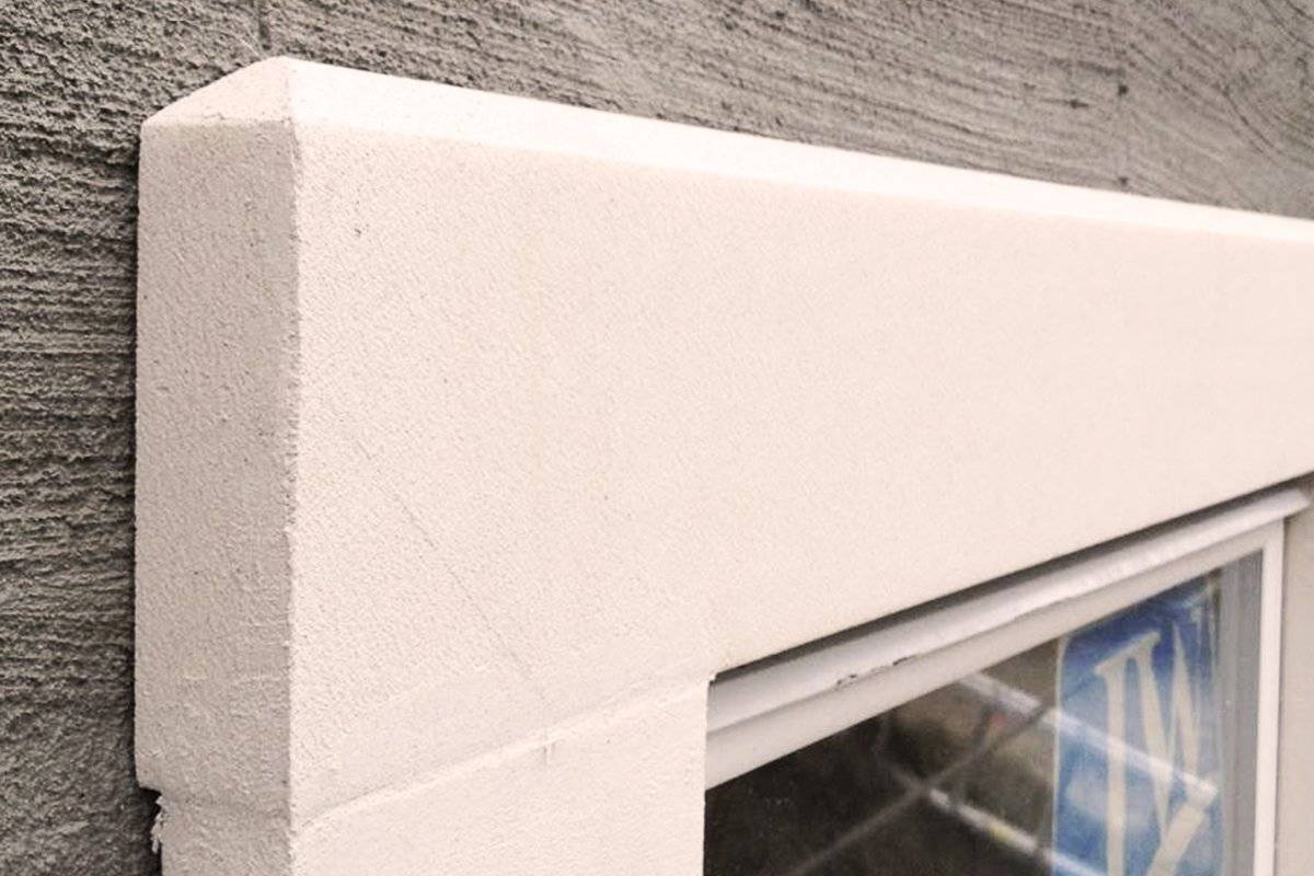 В ходе работы, обрабатываемые поверхности очищаются, замазываются цементным раствором, а сверху – грунтовкой. После монтируются пенопластовые детали – откосы обрабатываются клеем, обеспечивая прочное сцепление. Наклеивание производится от нижнего угла. Когда оклеен весь периметр, стыки еще раз проклеиваются для большей прочности – пустоты не должны образовываться. Излишки клея убирают губкой, после чего монтируют стеклосетку, все углы отделываются перфорированными уголками. Когда конструкция просохнет, наносят грунтовку. В качестве финишной отделки применяют акриловую краску подходящего колера, а для создания уникального оформления, поверхность оклеивают декоративными камушками.