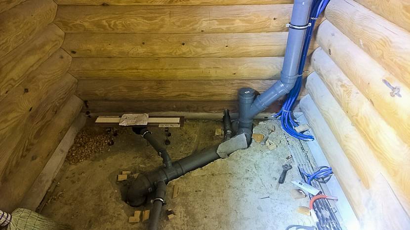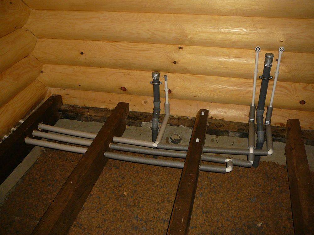 Работу начинают с канализации. Лучше для этого использовать пластиковую трубу диаметром 100–120 мм. В фундаменте делают желоб, в который укладывают слив. Ни в коем случае нельзя выводить трубу сквозь стены, она должна опираться на устойчивое основание. Внутри дома стояк крепят с помощью эластичных подвесов, при проходе через стены и перекрытия прорезают отверстия с запасом.