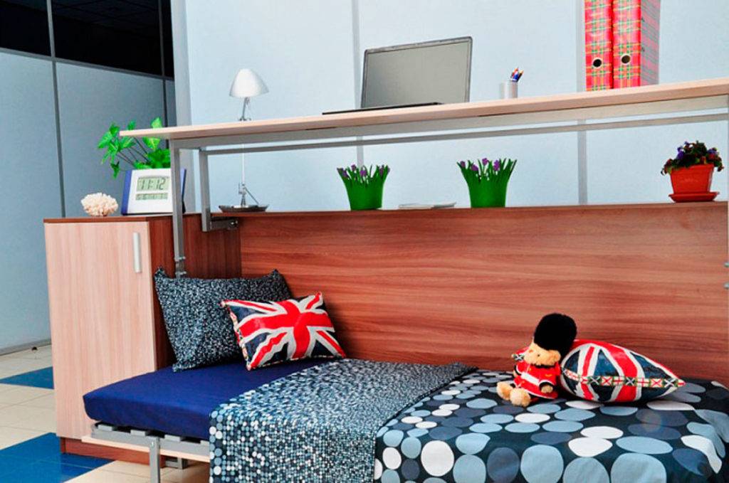 Стол-кровать позволяет выгодно организовать сразу две зоны – рабочую и спальную. Такая конструкция представляет собой полноценную кровать, способную трансформироваться в удобный стол.