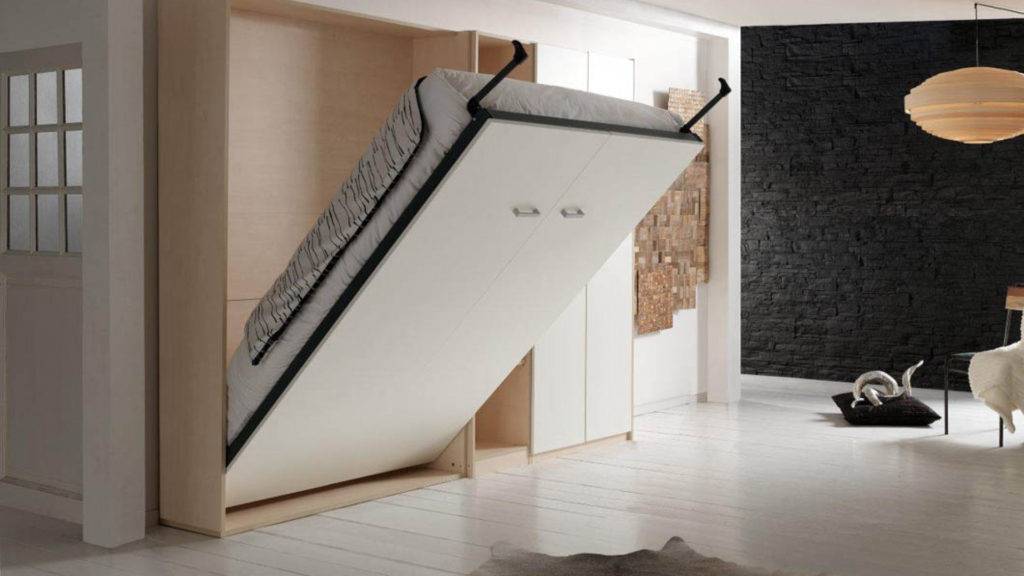 Откидная кровать будет уместна в очень тесной квартире. Днем она прячется в небольшом шкафу, превращаясь в кровать только на ночь.