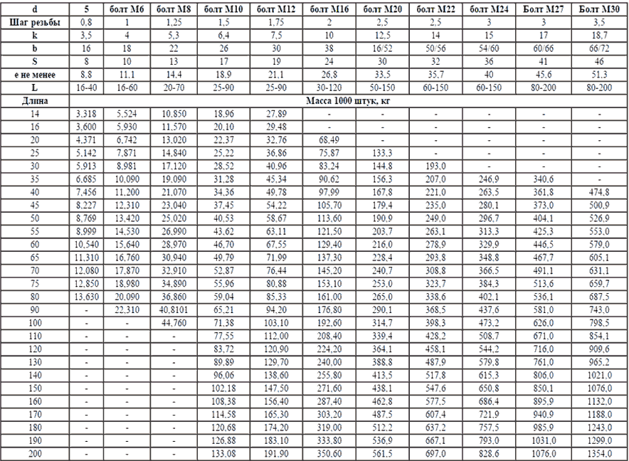 | L | Вес 1000 шт. болтов в кг | |||||||