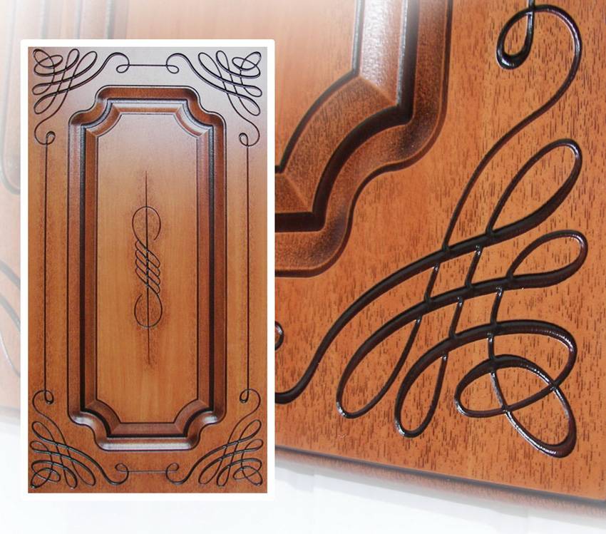 Если выбрана не ровная поверхность, а с рисунком, то сначала плита фрезеруется, а потом под давлением покрывается пленкой, чтобы последняя вошла во все углубления узора. Такая панель еще называется ламинированной.