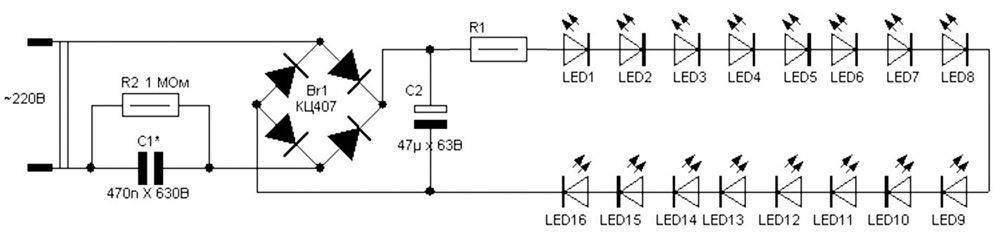 Эта схема подойдет для подключения светодиодов общей мощностью до 1 Вт