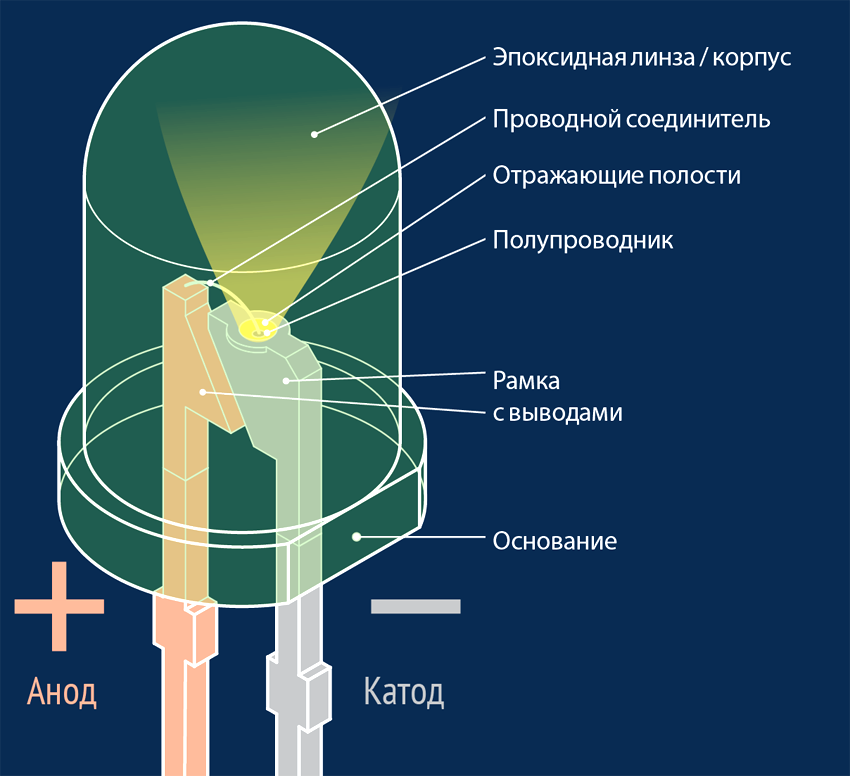 Эта информация ни к чему обычному обывателю. Достаточно знать, что светодиод имеет прочный корпус и контакты, которых может быть от 2-х до 4-х, а также то, что каждый светодиод имеет свое номинальное напряжение, необходимое для свечения.