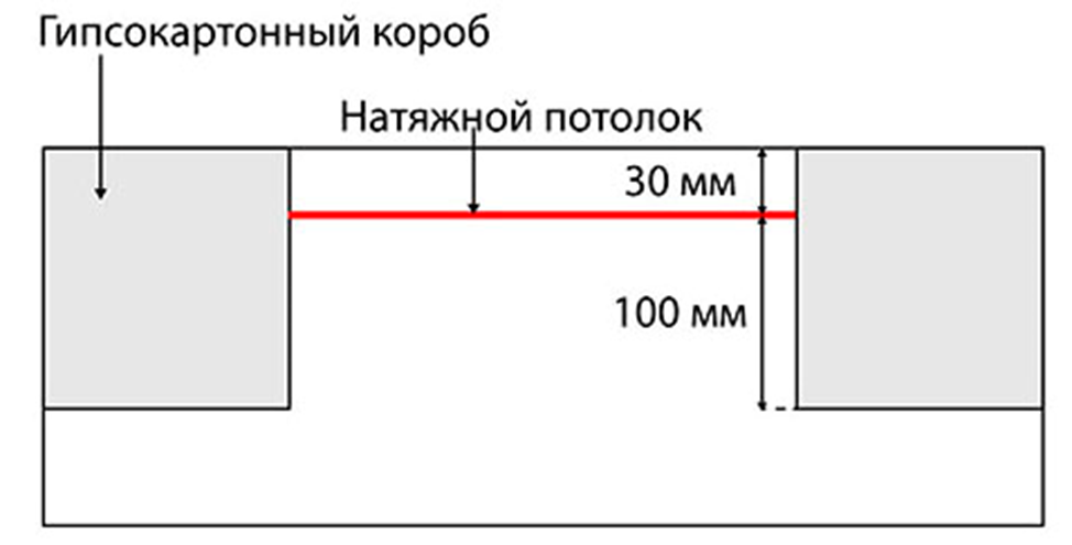 Важно принять во внимание, что натяжной потолок опускается на 3 см, поэтому его уровень с гипсокартонным не совпадает. Если вы хотите сделать выступ гипсокартонного потолка на 5 см, то устанавливать его нужно на 5+3 = 8 см, т.к. 3 см понадобятся для натяжного