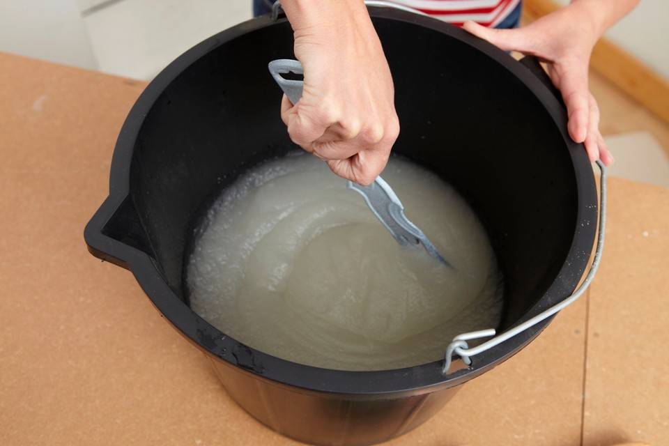 Нужно также развести клей, если он в виде порошка, в соответствии с указаниями производителя. Обычно смесь «вызревает» около 15 минут, после чего ею можно пользоваться.
