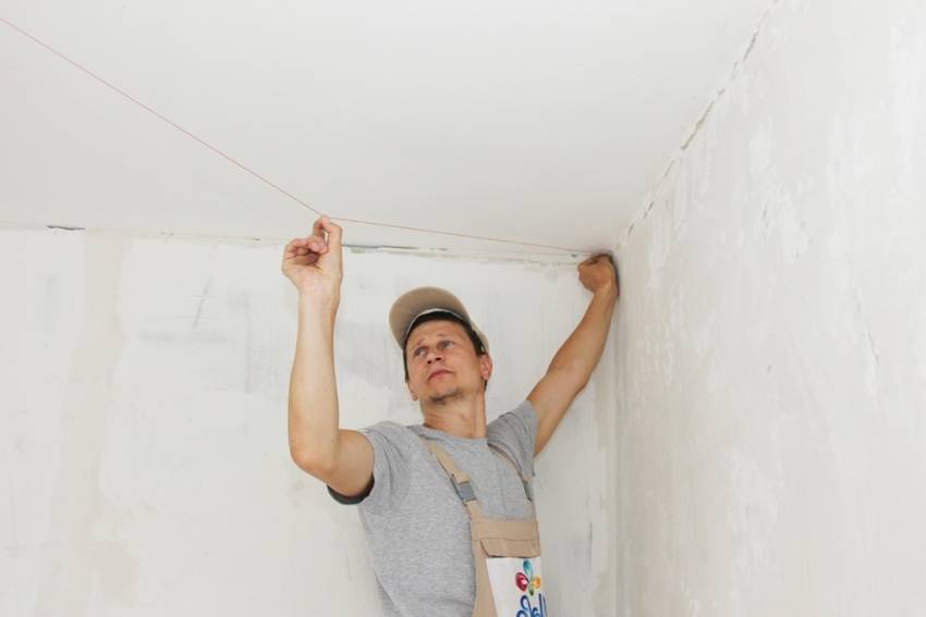 Стены по периметру потолка оклеивают малярной лентой, чтобы не испачкать покрытия. Валик предварительно хорошо выполаскивают под водой и прокатывают по любой черновой поверхности, чтобы избавиться от вылезающего ворса.