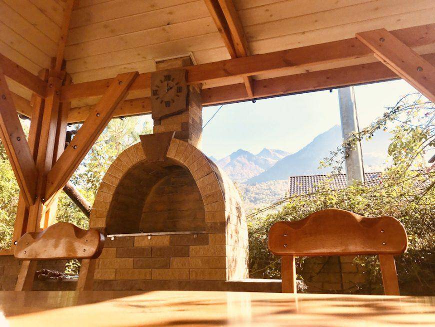 - Стационарный. Чаще всего делается из кирпича и дополняется крупным столом для гостей.