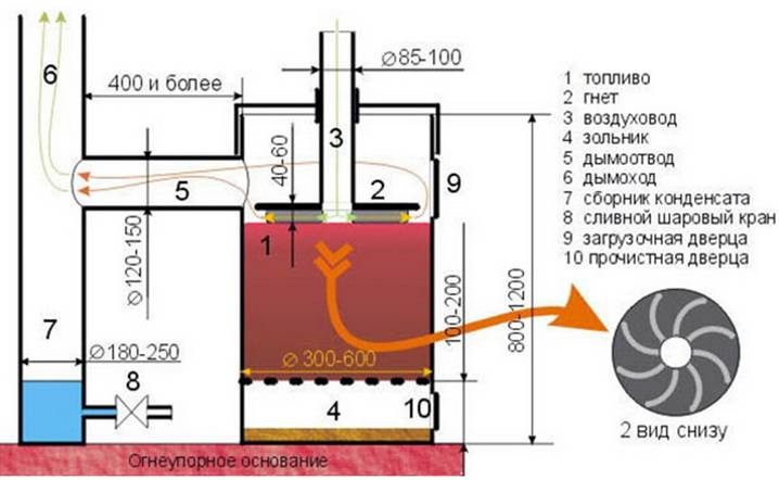 Фото 2. Чертёж угольной печи, сделанной из металла. Также стрелками указаны все части устройства.