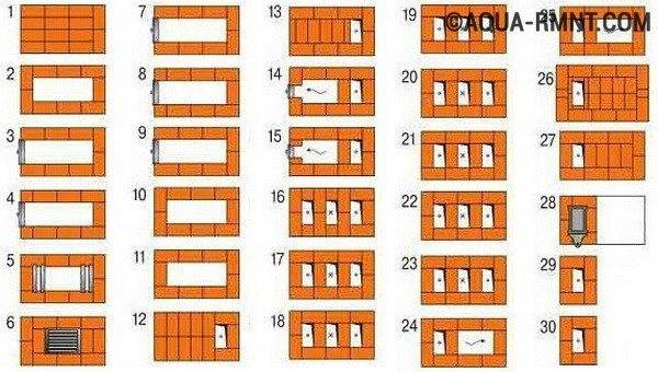 Для изготовления печи необходимо 290-300 кирпичей. Кладку выкладывают на шамотный раствор. Между кирпичами оставляют зазоры. Это необходимо для теплового расширения. Образование трещин на корпусе отопительного прибора из-за разности температур сведется к минимуму.