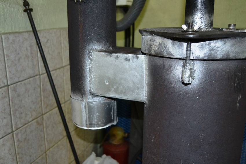 В соединительном трубопроводе сверлятся отверстия, как и в случае с конструкцией из газового баллона. К верхней крышке прикрепляется дымоход.