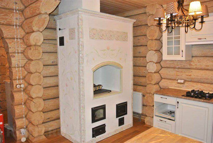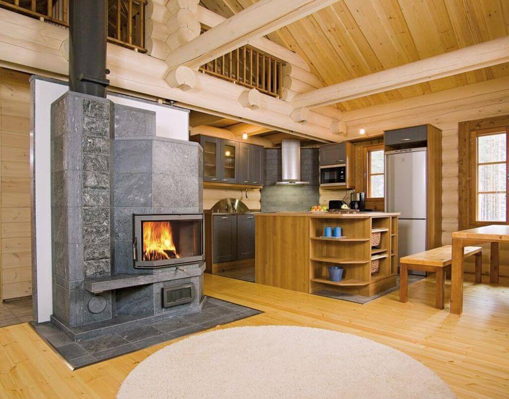 За счет такого расположения кухня быстро прогревается, хозяйке удобно готовить еду, а остаточное тепло, которое образуется для готовки, эффективно прогревает и все помещение. Таким образом, с одной закладки дров вы решаете сразу две задачи: в доме будет и тепло, и сытно.