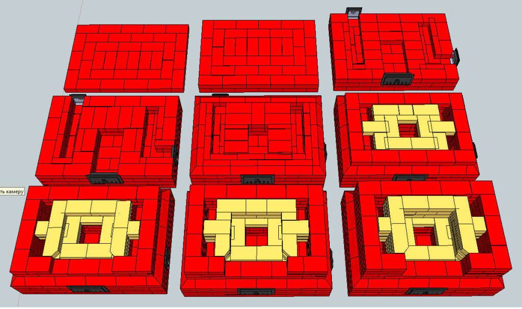 - 3 ряд. Размечаются кирпичом: слева зольная камера, справа пространство под духовкой (здесь укладывается четвертинка огнеупорного кирпича) и на заднем плане вертикальные каналы. Устанавливаются дверки: зольника (25 х 14 см), три для прочистки (14 х 14). Несколько кирпичей устанавливаются на ребро. Красного кирпича – 19 шт.
