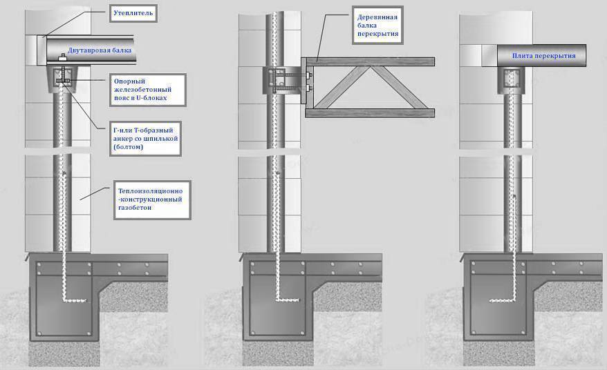 Для обеспечения правильной и эффективной работы вертикального армирования и несущих элементов здания, рабочую арматуру требуется анкерить в фундаменте в нижней части и в обвязочном монолитном поясе в верхней части. Армирование может быть выстроено в пределах одного этажа или проходить через все или несколько этажей.