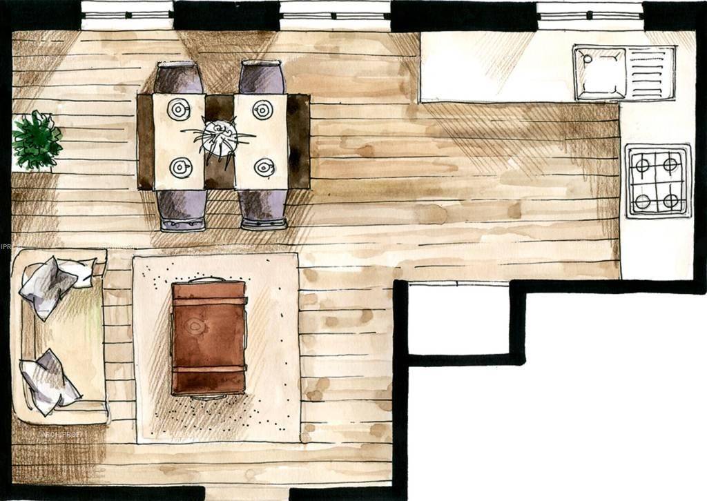 Кухня в большой гостиной. Водопровод и канализация подведены от санузла за примыкающей стеной