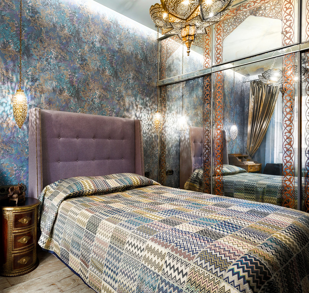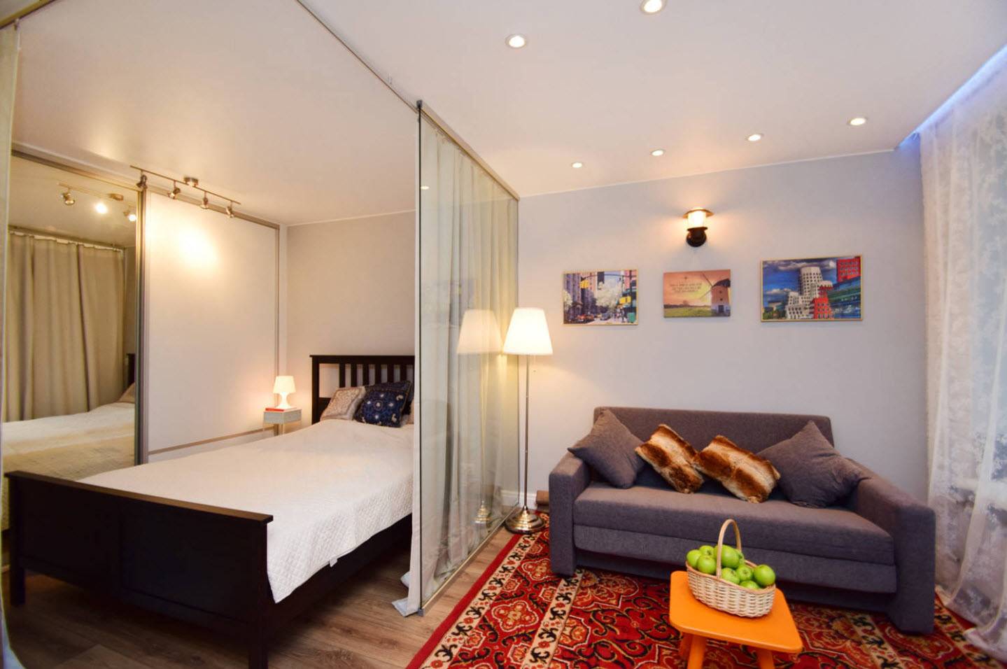 Согласитесь, что в малогабаритной квартире, в которой всего 2 комнаты, к тому же смежные, не приходится мечтать о просторной спальне. Поэтому это помещение должно быть такого размера, чтобы оно вмещало в себя кровать и пару тумбочек. Для создания интимной обстановки, вместо распашных дверей, рекомендуется установить раздвижные системы, которые мы видим на фото.