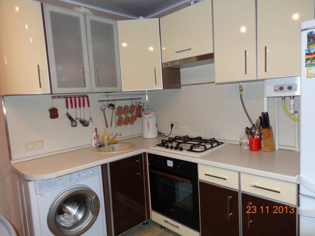 При размещении стиральной машины выбор также не велик. Скорее всего, она займет место одного из напольных шкафов. Чтобы избежать проблем с прокладкой коммуникаций, а затем с расположением дополнительных шлангов и труб, ставить ее целесообразно возле мойки. Если на кухне нет духовки, а установлена компактная варочная поверхность, то стиральную машину можно установить под нее.