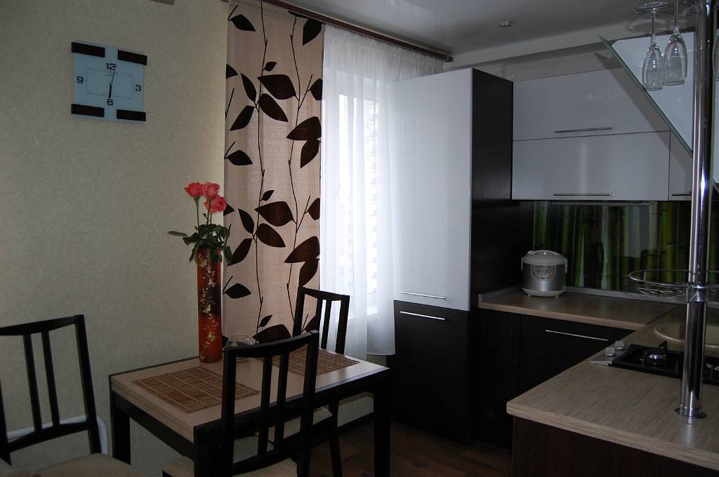 Прекрасным вариантом интерьера кухни, совмещенной с гостиной в хрущевке, как на следующих фото, станут легкие перегородки или ширмы, изготовленные из ткани, дерева, бамбука. Они могут иметь разную высоту, быть стационарными или переносными, а во время приема гостей позволят скрыть кухонное пространство от посторонних глаз.