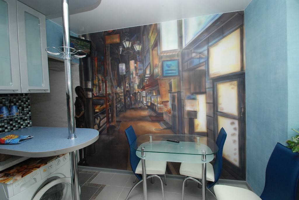 Для декора стен в интерьере гостиной, совмещенной с кухней в хрущевке, подойдут разнофактурные обои, отличающиеся своими цветовыми решениями. Допустимо их комбинирование с краской.