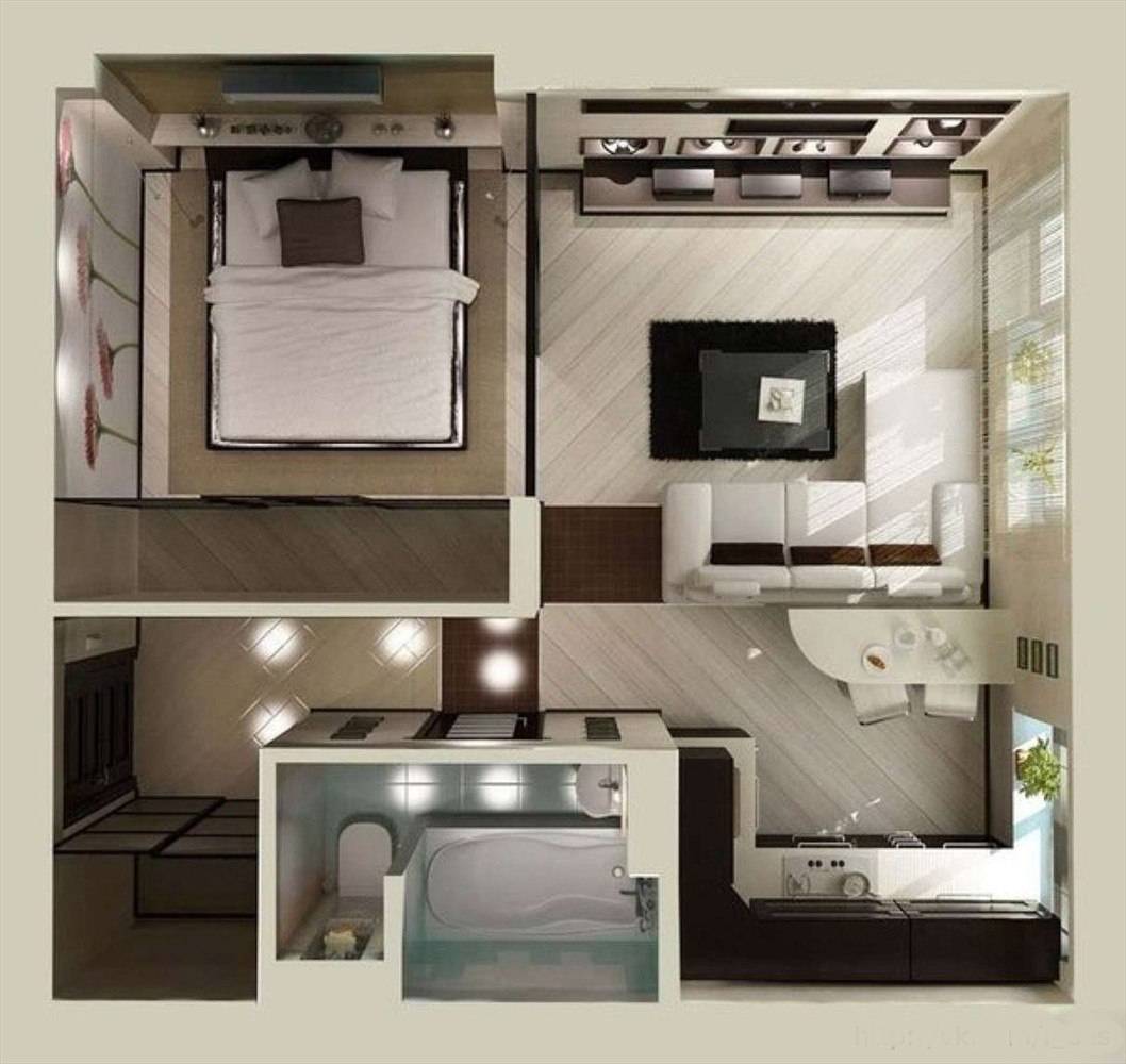 Небольшая отдельная спальня станет зоной уединения, а в кухне-гостиной можно будет принимать гостей и проводить вечера за просмотром телевизора. Отделить кухню от гостиной можно при помощи барной стойки,кухонного стола, дивана, используя разный материал отделки пола и стен – способов масса.