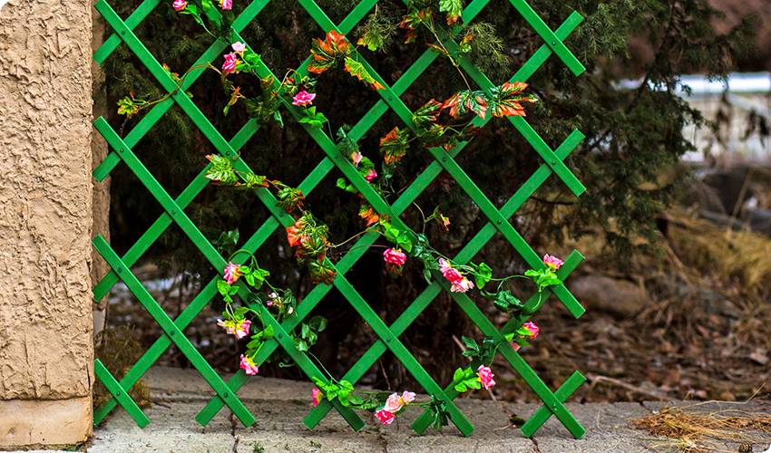 Ее можно сделать любой конструкции или приобрести готовую в магазине. Можно обойтись и вовсе без решетки, вбив с тыльной стороны столбов гвоздики и натянув между ними несколько рядов проволоки или капронового шнура, по которым будут виться растения.