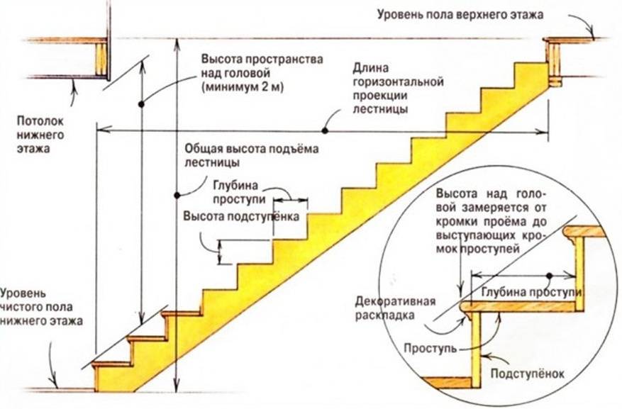 - высота – это расстояние от поверхности пола на первом этаже до напольной поверхности на втором. Чтобы правильно определить расстояние от ступени до потолка необходимо взять рост самого высокого человека в семье и прибавить 100 мм;