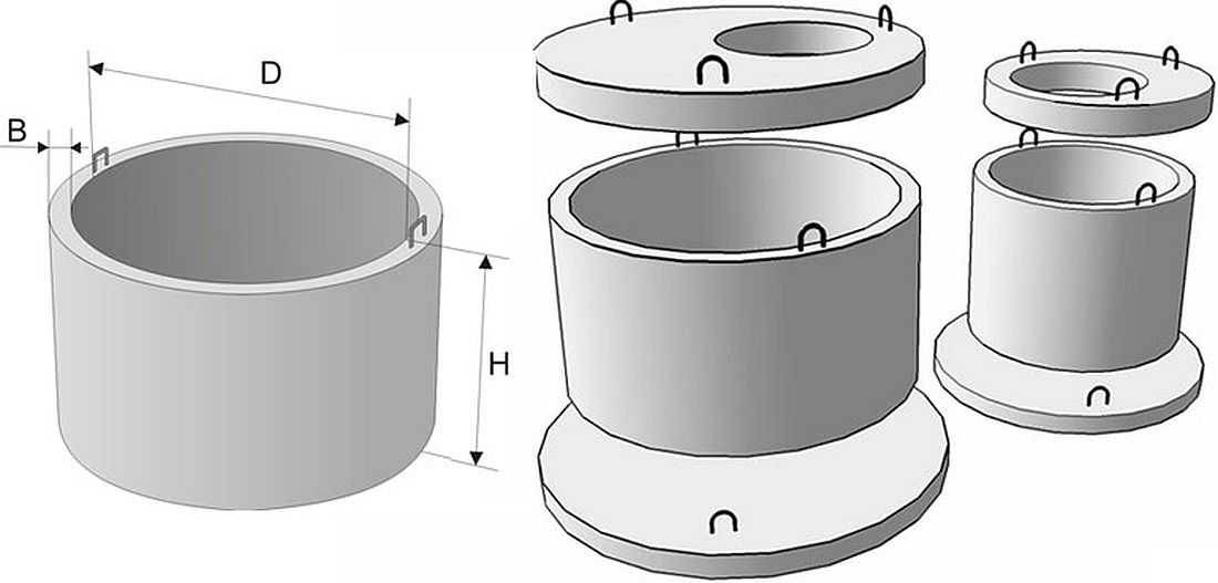 Для питьевых колодцев часто используют только один тип колодезных колец — КС. В маркировке дальше идут две цифры через точку. Например, КС 10.6. Первая цифра — это внутренний диаметр, указанный в дециметрах. Один дециметр равен десяти сантиметрам. Чтобы узнать диаметр кольца в сантиметрах, эту первую цифру надо умножить на десять (по сути, просто добавить ноль в конце). Например, КС 10.6 — внутреннее сечение 10*10= 100 см. КС 15.9 — 15*10 = 150 см.